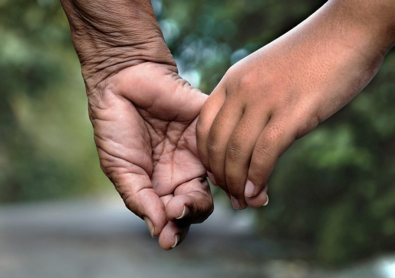 young woman and old woman holding hands