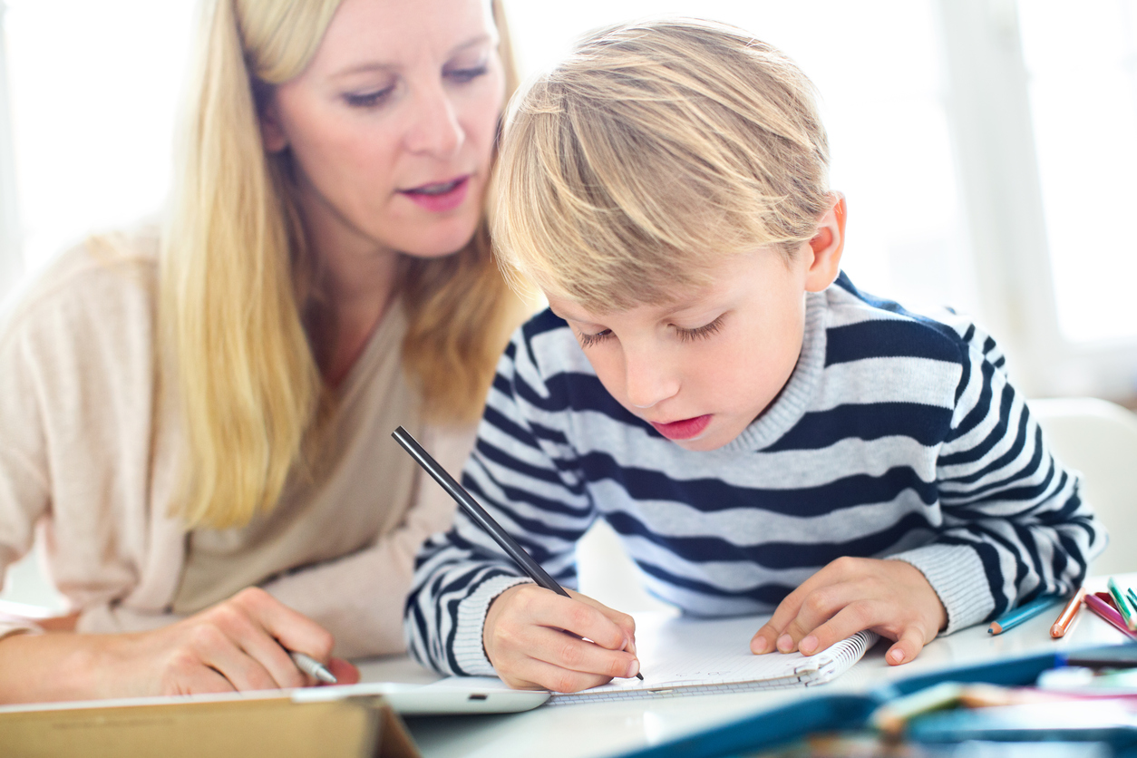 Mother helping son writing homework